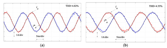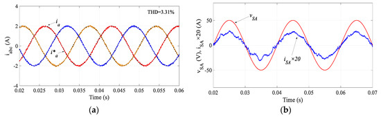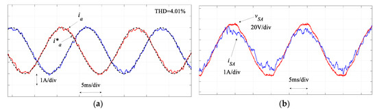 The proposed SMPC reduces the computational burden and can potentially improve the performance further. Compared with the traditional MPC, the computation burden is reduced because only the pre-selected switch states are evaluated in the second and subsequent sequential cost functions. In addition, the prediction model computation for the following cost functions is also reduced. These further improve the performance by increasing the sampling frequency of the algorithm. However, this is difficult to achieve in the traditional MPC because all switch states are evaluated in all cost functions; otherwise, some pre-selection technique must be applied. To verify this benefit of the proposed SMPC, the sampling time was reduced to 80 μs, which complies with the experimental implementation in the following section. The simulation results for the proposed SMPC with Ts = 80 μs are shown in Figure 6. The regulated output current is improved in terms of the waveform and THD (3.31%) and the input waveform is also improved.