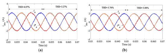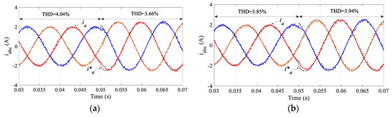 In addition, we evaluated the performance of the controllers under a reference step change. The results of the regulated output currents are shown in Figure 10. The reference current amplitude was changed from 2 A to 2.5 A at 0.05 s. As can be seen from the results, the controller can track the reference with fast dynamics. It can be concluded from these results that the performance of the proposed SMPC is comparative to that of MPC. However, unlike MPC, the proposed SMPC does not require complex weighting factor tuning.