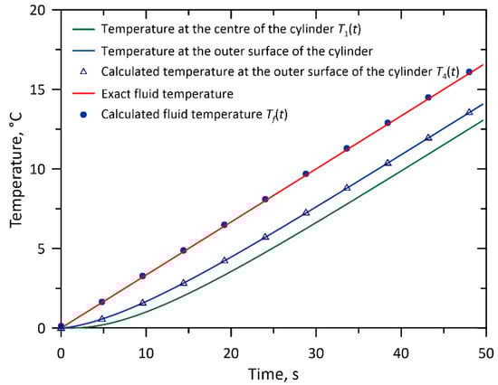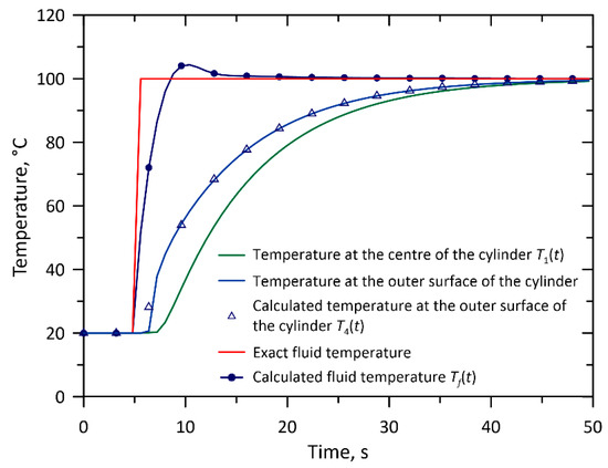 Fluid temperature and the temperature “measured” at the axis of the 15 mm diameter thermometer and on its outer surface—comparison of the exact temperature with the results obtained from the solution of the inverse problem for the linear rise in fluid temperature.