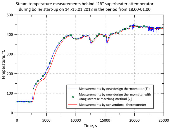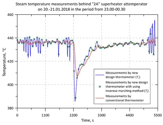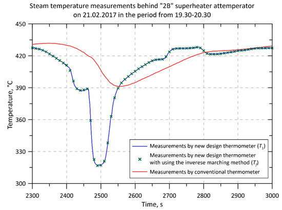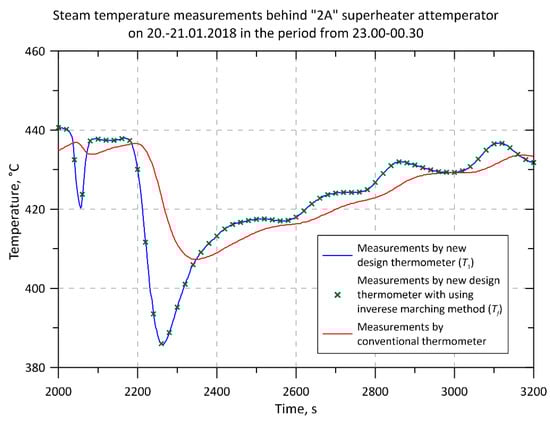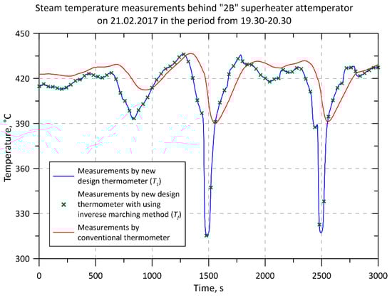 The descriptions in the legends in Figure 4, Figure 5, Figure 6, Figure 7, Figure 8, Figure 9 and Figure 10 are as follows. “Measurements by new design thermometer (T1)” and “Measurements by conventional thermometer” denote temperatures measured by new and conventional thermometers, i.e., temperatures indicated by temperature sensors (thermocouples) located inside these thermometers. The description: “Measurements by new design thermometer with using the inverse marching method (Tf)” means the steam temperature that was determined using an inverse solution based on the readings of the thermocouple in the axis of the new thermometer.