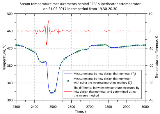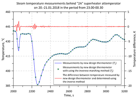 The analysis of measurement results (Figure 4, Figure 5, Figure 6, Figure 7, Figure 8, Figure 9, Figure 10 and Figure 11) of the transient steam temperature shows that the thermometer of the new construction has a much smaller dynamic error than the conventional thermometer. The biggest differences in thermometer indications can be observed during water injection on the temperature regulator (Figure 4, Figure 5, Figure 6, Figure 7, Figure 8, Figure 9 and Figure 11). The biggest difference in indications between the thermometer of the new and old construction is over 39 K (Figure 4) and 97 K and 93 K (Figure 7). Figure 4 and Figure 7 show the temperature indicated by the thermocouple located in the axis of the new thermometer (solid blue line) and the temperature of steam determined from the solution of the inverse problem (green crosses). Differences between these temperatures are small due to the high values of the heat transfer coefficient on the outer surface of the thermometer. The difference between the temperature of the steam determined from the inverse solution and the temperature of the thermocouple in the new thermometer is shown in Figure 6 and Figure 9. It can be seen that the value of this difference was in the range of −8 K to about 7 K (Figure 9), and in the case of the results shown in Figure 6 even smaller and ranged from about −1.5 K to 2 K. The larger differences between the temperature measured with the new thermometer and the temperature obtained using the inverse method shown in Figure 9 are caused by a bigger (in this case about 75 K) and a more rapid drop in the temperature of superheated steam. The new thermometer has thermal inertia, although small. Using the inverse method allows the temperature indicated by the thermocouple placed in the axis of the new thermometer to be corrected.