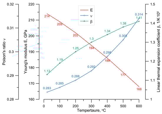 Young’s modulus, Poison’s ratio and linear thermal expansion coefficient for steel 14MoV63 as functions of temperature.