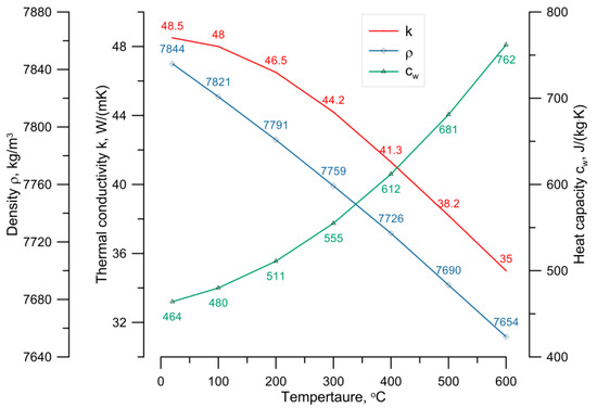 As shown in the previous chapters, the indications of the thermometer of the new design differ significantly from those of the conventional thermometer. The most significant differences are during sudden fluid temperature changes. In this chapter, the influence of the thermometer readings on the results of stress field calculations in a pressure element was analyzed. A coupled transient thermal-strength analysis was carried out for the outlet header of the boiler K11 on which the thermometer of the new construction has been installed. The outer radius of the header is 0.1365 m, and the wall thickness is 0.02 m. In the wall of the header, there is an opening with a radius of 0.0285 m. The header is made of boiler steel with a grade 13HMF (DIN symbol: 14MoV63). Figure 12 and Figure 13 show changes of the thermophysical properties as a function of temperature which were used in the calculations.