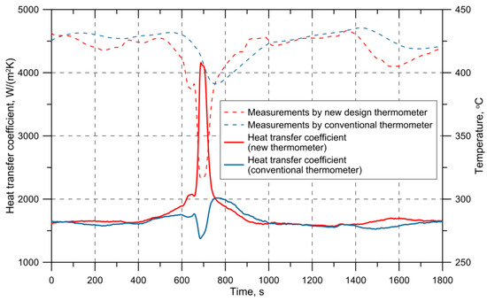 The maximum difference in the thermometers indication was equal to 96.9 K (Figure 14) after water injection. The analysis of the results depicted in Figure 14 shows significant differences between the heat transfer coefficients calculated using the indications of the new and the conventional thermometer. For 688 s (Figure 14), the value of the heat transfer coefficient was 1385 W/(m2K) when the fluid temperature indicated by the conventional thermometer was used. This value is three times lower than the value of the coefficient equal to 4160 W/(m2K), which was calculated using indications of the thermometer of the new design.