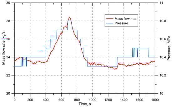 Thermal analysis was carried out for time changes in steam temperature according to the indications of the conventional and the new construction thermometer, as shown in Figure 14. For the temperature time changes the heat transfer coefficient on the inner surface of the header was calculated respectively for the indications of the new design and standard thermometers (Figure 14). Figure 15 shows changes in the steam pressure and mass flow rate.