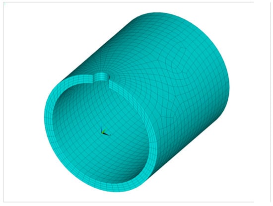 The analyses of temperature and stress fields were carried out using the FEM Ansys 19.1 package [22]. A sequential analysis was carried out, the first stage of which is the solution of the heat transfer issue. The temperature determined was then used in the strength analysis. Figure 16 shows a finite element mesh that was used in calculations.