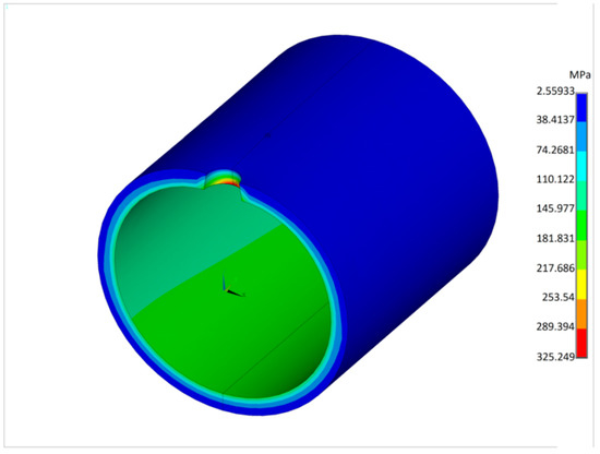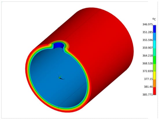 Figure 18 illustrates the von Misses stress field for the same moment in time. The stress value reaches its highest value for a time of 688 s. The highest stress value occurs for a time of 740 s for the calculation according to the indications of a standard thermometer.
