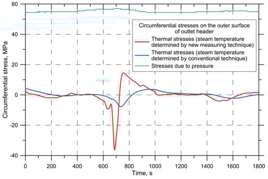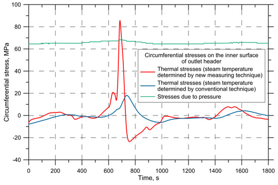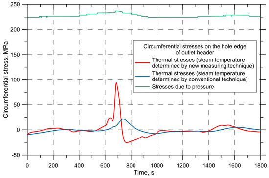 Circumferential thermal and due to pressure stresses on the hole edge of the outlet header computed using the steam temperature obtained by the proposed measuring technique and conventional industrial thermometer.