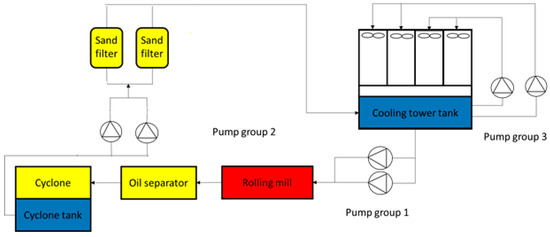 The cooling circuit under analysis includes a hot roiling mil, four cooling towers, three pump groups, four sand filters, one oil separator and a cyclone separator (Figure 1). The pump group 1 is constituted by two pumps that transport cooled water from a tank (Cold Water Tank) to the rolling mill. Then, the water stream flows down the channel to an oil separator and cyclone (Cyclone Tank) for the pre-treatment of water. The pre-treated water is distributed to two sand filters by the action of pump group 2, constituted by two pumps in operation. From the sand filters, the water stream flows back to the cooling tower tank. The designated pump group 3 is part of a secondary circuit, constituted by two pumps. Pump group 3 corresponds to the same type as pump groups 1 and 2 to reduce maintenance and logistic effort. This separate water stream is transported from the cooling tower tank to the four cooling towers and the outlet water streams from the cooling tower are then, transported back to the tank. This secondary circuit is part of a recent modernisation drive in the factory. Such modernization aims to improve energy efficiency. It was installed to allow the operation of the cooling towers only when required (i.e., when the temperature at the cold water tank increases above the operational target-value by 0.5 °C) and as soon as temperature drops the circuit stops. For instance, this may constitute a constraint for the process optimization based on energy efficiency improvement, in which the temperature of the cold water tank must not be exceeded by 0.5 °C relatively to its target-value. Otherwise, this operational requirement is considered to be surpassed. The separation of the cooling towers from the main circuit also allows a closer control on the cooling process as the water demand in the circuit is variable. This is because the billets are produced in batches and due to the existence of variabilities in the material and the rolling mill operational conditions, such as rolling speed and cooling speed.