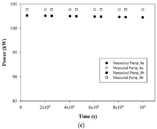 Numerical and measured pump power (a) pump group 1, (b) pump group 2 and (c) pump group 3.
