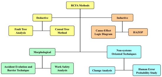 RCFA includes several methodologies (see Figure 2) that are very similar to each other, even making them seem redundant, since, when analyzed together, they constitute a means of globally considering all the factors that can contribute to the failures of an equipment or system. These techniques usually consist of checklists, which, arranged in increasing order of complexity, include simple lists, lists with cross-referencing systems, simple trees without fault tree logic and trees incorporating fault tree logic [16].