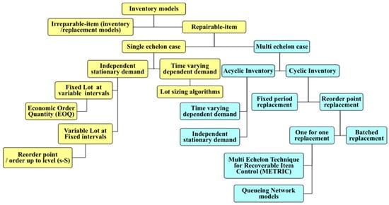Because there is more than one manner of organizing the models, Figure 4 shows an alternative classification that expands and complements Figure 3. In every maintenance strategy and tactic, logistics (inventories and transport) play an important role; therefore, Figure 5 shows a classification of the methodologies used for optimizing inventory management.