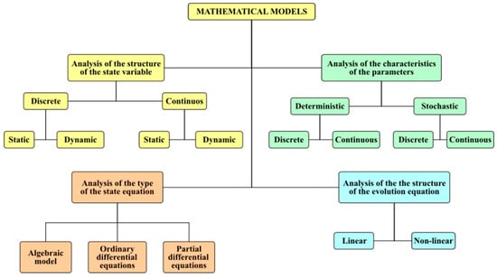 A MatM is a set of equations that represent a physical system. The equation that defines the model is called an equation of state, and its solution allows knowing the evolution of the independent variable, both in time and space [10,11]. MatMs can be classified in different manners, starting with a conventional and simple form shown in Figure 6.