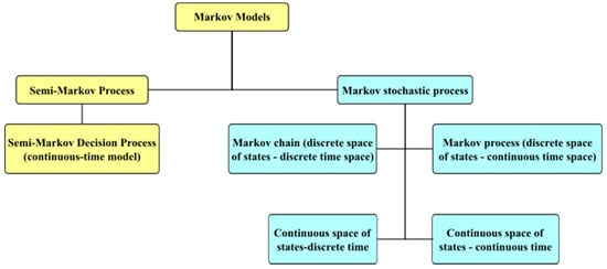 MatMs are used in all branches of science and engineering and are the tools that allow the strategies to be implemented. Their classification can vary depending on the criteria of each area and subarea of knowledge in which they are used. For example, referring to maintenance, a classification alternative is to group them according to the MMs shown in Figure 1, Figure 2, Figure 3, Figure 4 and Figure 5, but regardless of the classification performed, the fact is that in general, all the strategies involve more than one maintenance model and several associated MatMs [67]. A common factor between the MMs is the determination of the reliability of the system or its components by stochastic MatMs, which, according to [68], include probability density function f(t), probability that the life time T is within an interval (a,b), cumulative distribution function F(t), reliability function R(t) and failure rate function λ(x) that are given by the Equations (2)–(6) respectively: