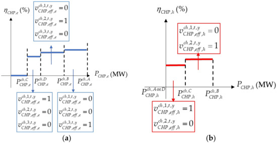 where be and bh are indices of the boundary segments of electricity and heat generation efficiency function, respectively. Each of these variables is equal to 1 if the corresponding CHP resource generates electrical energy determined in the specific efficiency segment and it is equal to 0 otherwise. Examples of segment selection with these variables are illustrated in Figure 4.