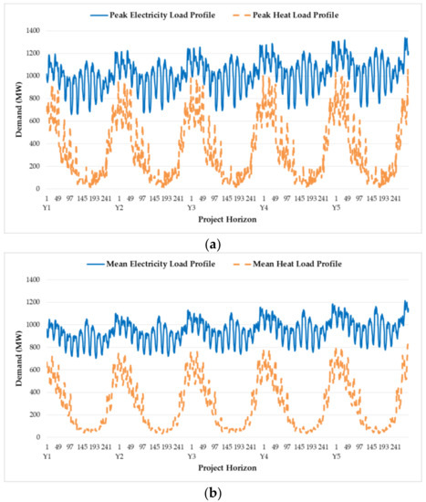 The planning horizon of 5 years considers 288 h (24 h × 12 months) per year instead of the total 8760 h to reduce the computational burden. The annual interest rate and demand growth rate are considered according to [34]. We considered the profiles of peak and mean load per month to generate the 288-h load profiles. The complete 8760-h load profiles were categorized by hour and month. For generating the peak load profiles, single-day load profiles containing the peak load per month were extracted from the 8760-h load profiles. To generate the mean load profiles, we calculated the average load every hour per month. Then, we collected the peak and mean load profiles considering the demand growth rate for 5 years to obtain the profiles shown in Figure 5.