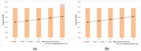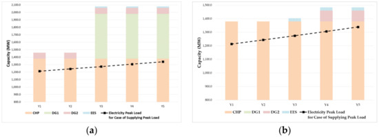 The difference of the generation expansion planning results using models A and B is depicted in Figure 6 and Figure 7. Figure 6 shows the planning schedules for supplying peak electricity load, whereas Figure 7 shows those for supplying peak heat load. The total capacity of electrical energy resources in the planning obtained from model A was much larger than that from model B as shown in Figure 6a, because electricity generation of the CHP resource in model A was limited by the constant heat-to-power ratio. In model A, even a high electricity demand retrieved a low amount of electricity generation of the CHP resource when heat generation was low. On the other hand, the total capacity using model B did not exceed 15% of the peak load per year as shown in Figure 6b. The electricity generation of the CHP resource in model B was not relatively limited by the heat-to-power ratio as in model A, because this resource can flexibly generate heat and electricity on the feasible operation region. Therefore, the difference between planning schedules using models A and B was considerable, especially during year Y3, where all the electricity generation resources were installed in model A for supplying the electricity peak load, whereas electricity generation resource DG1 was not installed in model B. This difference was notably reflected in the costs obtained from the models.