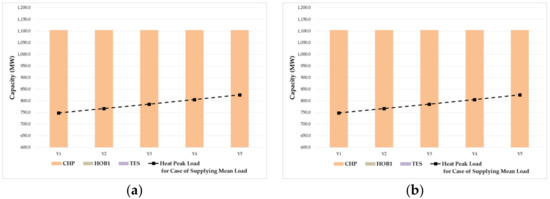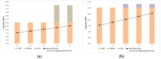 The planning schedules for supplying heat peak load were very similar to those for supplying electricity peak load. Heat generation of the CHP resource can supply enough heat load until planning year Y2, as the heat peak load was much below its capacity. In model B, energy storage resource TES was installed on planning year Y3 for utilizing surplus heat, whereas in model A, boiler HOB1 was installed from planning year Y4 for supplying heat load through the CHP resource.