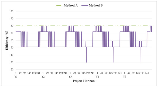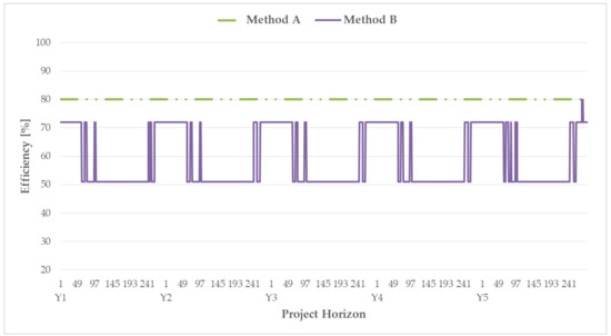 The total generation efficiency profiles of the CHP resource by the optimization models for supplying peak load are depicted in Figure 8. The profile of model A corresponds to the horizontal line, whereas the profile of model B varies along the project horizon. Overall, the total generation efficiency of the CHP resource using model A was higher than that using model B. Hence, the total variable cost of the CHP resource using model B was mostly higher than that using model A. Using model B, the total generation efficiency can be inferred from periods in the project horizon. For instance, the total generation efficiency in the period from 1 to 48 (i.e., from January to February) was mostly the highest because the CHP resource should supply a large heat demand during winter. In contrast, the total generation efficiency in the period from 144 to 240 (i.e., from June to October) was mostly the lowest because heat demand was low. From planning year Y3, the total generation efficiency reached the lowest value during summer because the operation of energy storage resource TES substituted the small amount of heat generation required from the CHP resource.
