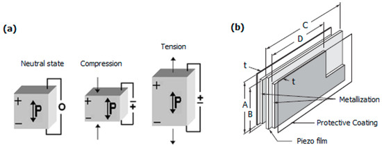 Piezoelectricity: (a) piezoelectric effect generated by an external force [32] (b) dimensions of a piezo film (with reference to Table 1) [26].