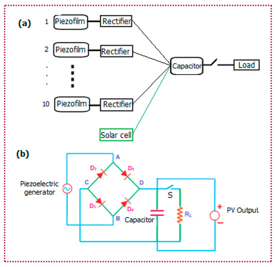 The power output by the sheets of the PV films was enough to readily run a small electronic device while that by the sheets of the piezo films was insufficient to directly drive a device. This is somewhat expected because each sheet of piezo film is only capable of producing a small power output due to its inherent technical limit. To resolve this, a capacitor was placed before any power was applied to the load. Figure 4a,b show the logic and actual design details of the constructed circuit for the integration of the PV and piezo power output. For a moderate level of wind speed (7–8 m/s), a single piezo film generates a very small amount of electricity with a very high spike of voltage. To deal with this situation, a full wave bridge rectifier was used to handle the electrical output from a single piezo film; the electrical output was rectified to charge a capacitor. That is, the electrical output of each piezo film was processed with a rectifier before it was integrated with the others to charge a capacitor. Before proposing this power accumulating circuit, attempts were made to integrate the generated AC output power by piezo films without using a separate rectifier circuit. However, this was not feasible for due to sporadic movements of the piezo films and produced very low output power. To overcome this technical problem, the proposed circuit was designed for maximum power accumulation by exploiting the piezo films.