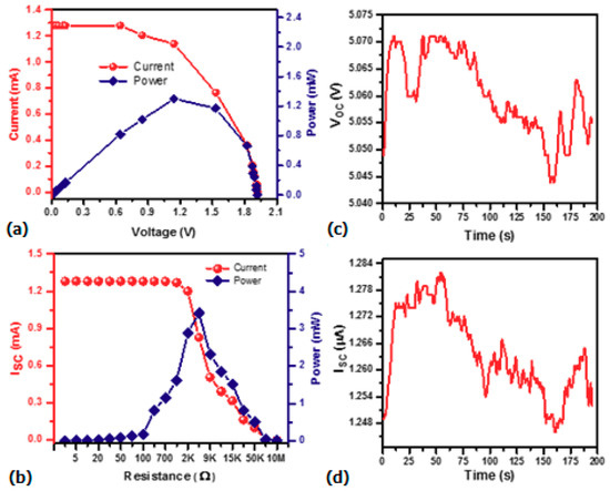 Combined output parameters of the TSHG: (a) combined open circuit voltage (b) I-V characteristics curve of a single PV film (c) combined short-circuit current (d) power output at different loading conditions.