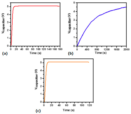 Figure 8 shows three different cases of charging the capacitor. Figure 8a shows a fast charging process delivered by the PV films. It took only 15 seconds to charge the capacitor to its saturated electric potential of 5.045 V. Figure 8b shows the case when it was charged only by the generated currents from 10 sheets of piezo films. As shown, the capacitor was charged very slowly. It took 35 min to charge the capacitor up to 4.38 V. As compared to the case of the piezo films, Figure 8c shows the charging of the capacitor when both outputs are used from the sheets of the piezo and PV films. As shown, no appreciable difference is observed compared to Figure 8a because most of the power is generated by the PV films.