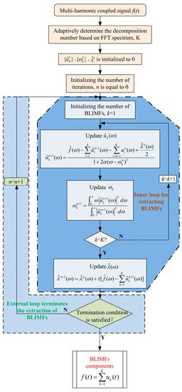 For the inner loop, the intrinsic modal component (uk) of the finite bandwidth, the modal center frequency (ωk), and the Lagrange multiplier (λ) are sequentially updated in accordance with Equations (3), (4), and (5), respectively. The BLIMFs can be obtained through the following implementation process.