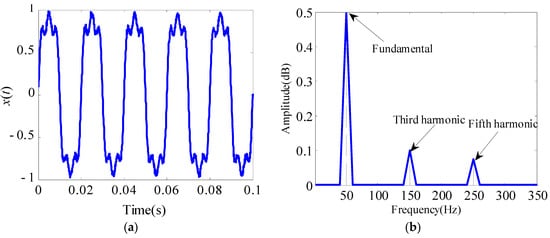 The sampling frequency is 10,000 Hz and the sampling point is 1000; thus, the simulation duration is 0.1 s. The time-domain response of the test signal is presented in Figure 3a. The harmonic characteristic of the test signal is significant. Then, the harmonic characteristic parameters are extracted using the proposed detection method.