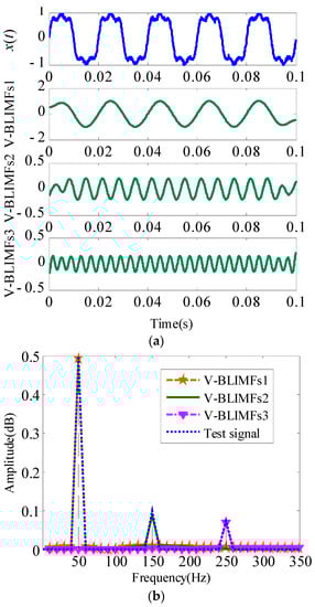 After the decomposition number is determined, signal x(t) is decomposed using the AVMD algorithm, and the result is shown in Figure 4a. The original test signal x(t) is decomposed into three harmonic components, namely, V-BLIMFs1, V-BLIMFs2, and V-BLIMFs3, which are fixed-frequency and equal-amplitude periodic components. The FFT algorithm is used to perform spectrum analysis on each component decomposed by the AVMD algorithm, and the results are shown in Figure 4b. The three BLIMFs components derived from AVMD decomposition have a fixed and stationary frequency, and the instantaneous amplitudes are close to the theoretical values.
