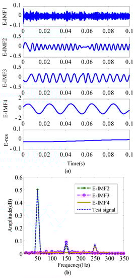 To further illustrate the advantages of the proposed method in harmonic detection, the EMD decomposition results are used for comparative analysis. The results are provided in Figure 5a. As shown in the figure, four IMF components and one trend component are obtained. The number of IMF components is equal to the harmonic component of the test signal, but E-IMF1 does not completely contain the noise component of the test signal. Several noise components are also included in E-IMF2 and E-IMF3, thereby causing local distortion in the waveforms. To analyze the frequency-domain characteristics of the periodic components decomposed by EMD, the results are shown in Figure 5b. A significant mode-mixing phenomenon occurs; that is, the amplitude–frequency characteristic of the fundamental component contains the third harmonic component of 150 Hz, which reduces the accuracy of harmonic detection in the power system.