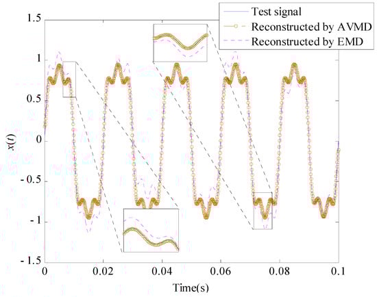 The characteristic parameters in Table 1 extracted from the AVMD and EMD harmonic detection algorithms are used in signal reconstruction, and the reconstructed results are presented in Figure 6. The calculation results of the fitting accuracy based on the SNR are shown in Table 4. A conclusion can be easily drawn that the test signal reconstructed by the proposed method exhibits good fit to the original signal, and the SNR calculation result is higher, thereby indicating that the reconstructed signal fits well with the original test signal.