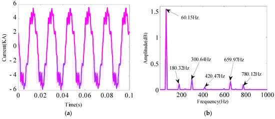 Waveform and FFT spectrum of the measured current signal containing harmonics. (a) Waveform of measured current signal containing harmonics. (b) FFT spectrum of measured current signal containing harmonics.