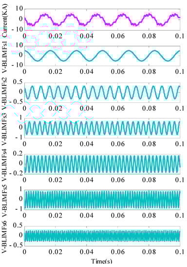 The VMD algorithm transforms the signal decomposition process into the establishment and solution of the constraint variational model, thereby adaptively decomposing the multi-harmonic coupled signal into a multiple of bland-limited intrinsic mode functions (BLIMFs); each intrinsic component has a tightly distributed characteristic around its respective central frequency [23].