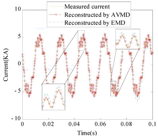 The harmonic parameters in Table 5 extracted using the AVMD and EMD algorithms are used to reconstruct the signals, and the results are shown in Figure 9. The signal reconstructed by the proposed method is better fitted to the original measured signal. Meanwhile, the calculation results of the SNR given in Table 6 indicate that the proposed method exhibits good superiority in harmonic parameter detection.