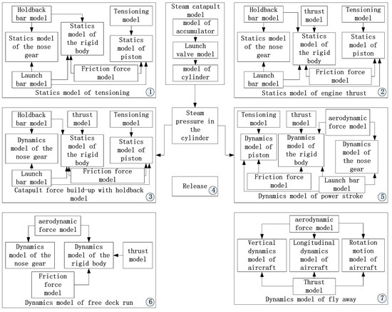 Catapult launch process for carrier-based aircraft is mainly divided into nine stages in Section 2. In this article, the mathematical model of catapult launch process is corresponding to the latter eight stages. The structure block diagram of catapult launch process for carrier-based aircraft is shown in Figure 3.