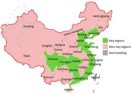 The environmental issues caused by industrial emission, such as the greenhouse effect, acid rain, and haze, have become increasingly acute and attracted attention from the national government and society. China’s government has promulgated Guiding Opinions [] in 2010 to deal with waste gas emission. The main line of the Guiding Opinions is to set key regions and establish an emission reduction target of air pollutants during the 12th five year plan (2011–2015) for cities in the key regions. The government measures in emission reduction for the key regions include installing waste gas treatment equipment like desulfurization, denitrification, and dust removal equipment in the industrial sector, imposing restrictions on high energy consumption industries that lead to air pollution (such as steel, cement, and glass industries), and accelerating the promotion of clean energy and new energy. The key regions include 14 provinces, as shown in Figure 1 below.