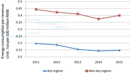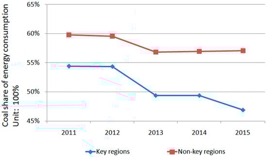 In Figure 2, we compare the energy intensity between key and non-key regions using the proportion of energy consumption and revenue of China’s industry sector (unit: TCE per 100 million RMB) according to Energy Statistical Yearbook of China [,,,,]. Similarly, the coal share of the total energy consumption (including coal, petroleum, natural gas, and electricity) is compared in Figure 3 using the proportion of coal in total energy consumption (unit: 100%), because coal is the main cause of waste gas emissions. As a result, a lower level and significant decrease trend can be found in the key regions from 2011–2015.