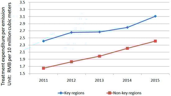 We find there is an increase of the treatment expenditure which can reduce emission in China’s industry sector from 2011–2015.Considering the efforts of emission reduction, we set up a new indicator called treatment intensity. The definition of treatment expenditure per cubic meter of emission is calculated by the proportion of expenditure of industrial waste gas treatment facilities (including desulfurization, de-nitrification, dust removal, etc.) and the volume of industrial waste gas emission (including CO2, SOx, NOx, soot, etc.), according to the China Statistical Yearbook on Environment [,,,,]. The treatment intensity reflects the input level of waste gas treatment. The local economic development is crucial to treatment intensity, but the government policy is also considered as a common cause of regional differences. For instance, the average treatment intensity value from 2011–2015 of Hunan (2.91), Hubei (2.11), Sichuan (2.37), and Chongqing (2.38), which are key regions, is higher than that of Anhui (1.98), Henan (1.84), and Shaanxi (1.98), which are non-key regions, even though they have a similar economic development level. As shown in Figure 4, we find the increasing trend in both key and non-key regions. However, the treatment intensity in key regions is higher than that in non-key regions, despite the lower energy intensity and coal share in key regions. So we think there is difference between the regional treatment intensities of key and non-key regions, and the gap would not be filled in the next few years.