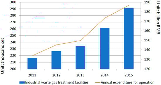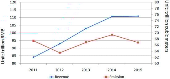 When the previous studies assessed the energy efficiency through DEA, labor, capital, and energy consumption are generally taken as inputs, and GDP and CO2, respectively, refer to the desirable and undesirable outputs. As mentioned above, Guiding Opinions promulgated by the Chinese government in 2010 have a mandatory requirement that the enterprises in industrial sectors should achieve emission reduction targets during the 12th five year plan (2011–2015). We find that the number of industrial waste gas treatment facilities (i.e., facilities) in China’s industrial sector has increased obviously during the five years, and annual expenditure for operation of industrial waste gas treatment facilities (i.e., expenditure) also has a significant expansion. Figure 5 shows the trends of facilities and expenditure from 2011–2015.Aremarkable rise is found in revenue of China’s industrial sector from 2011–2015, while emission relatively maintains a stable level, as shown in Figure 6. So we believe expenditure has played a positive role in restraining the growth of emission but increase the company’s cost of input. This general trend provides an objective basis in introducing expenditure as a new input variable in this study.