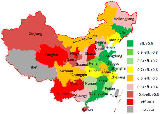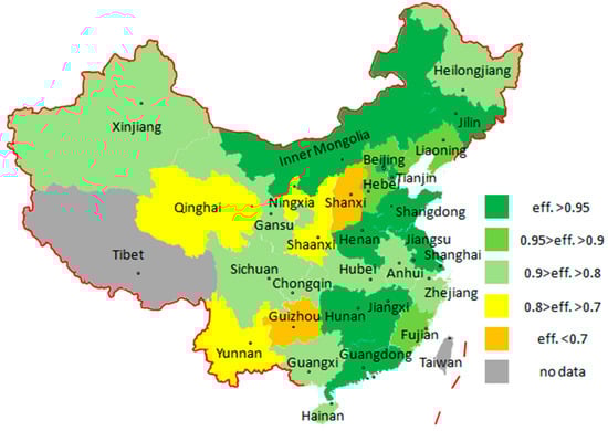 On the basis of the results in this study, it is argued that the level of treatment intensity of key regions is higher than that of non-key regions, which generally leads to better performance of emission reduction, such as Hubei, Hunan, Chongqing, and Sichuan in the central or western area of China. This is different from the results derived by Du [] and Wang et al. [], which indicate that DMUs in the central and western area of China have worse energy performance.