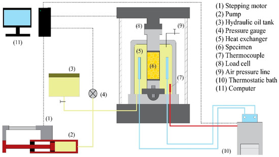 In this study, all the HBMS were sheared by a triaxial apparatus (TAW-60, Chaoyang Test Instrument Co. Ltd., Changchun, China), and a schematic diagram of the triaxial testing system is shown in Figure 1. This triaxial apparatus consists of four systems: an axial loading system, a temperature control system, a confining pressure servo system and a computer control system. The function of the axial loading system is to provide axial pressure to the sample with a normal loading capacity of 60 kN with a pressure precision of 0.01 kN by an axial servo motor and a removable piston. The temperature control system can ensure the temperature of the pressure chamber ranging from −30 °C to 30 °C with a precision of 0.1 °C, using a thermostatic bath and an internal heat exchanger around the sample. The confining pressure servo system provides a confining pressure with a maximum of 30 MPa and a pressure precision of 0.01 MPa by a plunger pump. The data acquisition and the experimental parameter setup are accomplished by computer control system, which consists of the control software entitled “Test”, a full digital servo controller (DOLI Elektronik Co. Ltd., Munich, Germany), a pressure transducer and a temperature transducer.