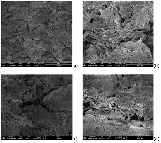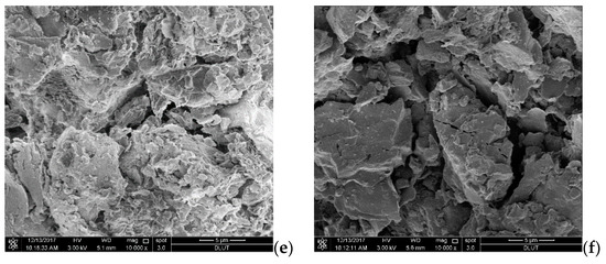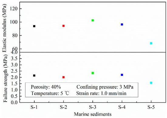 A comparison between the mechanical properties of HBMS formed by S-1, S-2, S-3 and S-4 marine sediments in Figure 6 clearly shows that the elastic modulus and failure strength of HBMS S-3 and S-4 are higher than those of other HBMS, which can be explained by the fact that S-3 and S-4 marine sediments have a better particle gradation, as shown in Table 1. For the sediment matrix with a better particle gradation, the number of contact points between large particles and fine particles in the unit volume may increase and enhance the shear strength of HBMS [38,41]. However, it is clear that HBMS S-5 displays lower stiffness and failure strength compared to the other HBMS. Table 1 shows the mean particle size of the marine sediments gradually declines with the increase of drilling depth, which may cause the lower failure strength of HBMS formed by S-5 marine sediments [45,46]. Another reason for this phenomenon is that, as shown by the SEM images of S-5 marine sediments, the soil particles are mostly a sticky flocculent shape. According to Hyodo et al. [38], high effective stress may produce the occurrence of a sticky flocculent shape of soil particles, reducing the failure strength of hydrate-bearing sediments. Hence, for this study, the increase of drilling depth would bring about higher effective stress and lead to the decline of the failure strength in HBMS.