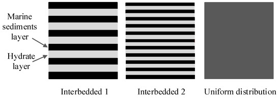 During the sample-remolding process, ice powder (average particle size of 250 μm) was made and placed into a high-pressure reactor. The reactor was then sealed and methane gas of 10 MPa was injected into the reactor to generate CH4 hydrate in the next 48 h. The hydrate saturation was approximately 30% in this hydrate formation method. Afterwards, according to the pre-designed porosity (40%), a certain amount of hydrate containing ice and marine sediments was weighed, mixed equally and put into the remolding device to form the sample of HBMS (100 mm × 50 mm). In order to obtain samples with different hydrate saturations, we put pure ice powder into hydrate containing ice to alter the hydrate saturation. To form the interbedded sample, hydrate containing ice and marine sediments was placed into the molding device by turns to form a sample with 11 different layers (Interbedded 1) or 21 different layers (Interbedded 2), as shown in Figure 4. All of the above work was conducted in a cold room (−20 °C) to reduce hydrate dissociation.