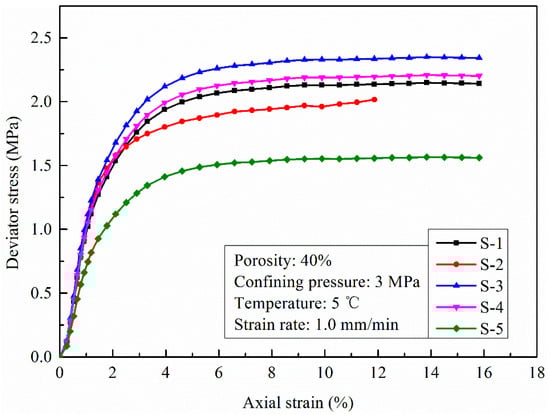 In Figure 9 and Figure 10, the stress–strain curves of HBMS with different hydrate saturations and different existence forms of hydrate all exhibit hyperbola behaviors with strain hardening. Nevertheless, the maximum deviator stress of HBMS changes with hydrate saturation and the existence form of hydrate.