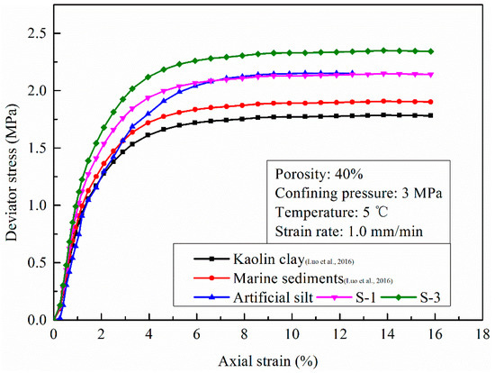 To find one possible kind of soil which can replace marine sediments in massive and systematic triaxial shear tests, hydrate-bearing artificial silt and hydrate-bearing kaolin clay were remolded and used for the investigation. The relationships between stress–strain curves and different kinds of soil observed are displayed in Figure 7 and Figure 8. The similar strain hardening phenomenon, elastic modulus and failure strength show that the mechanical characteristics of remolded HBMS and hydrate-bearing clays are nearly consistent. Hence, we suggest that the kaolin clay and artificial silt could be used to investigate the mechanical stability of hydrate reservoirs instead of marine sediments.