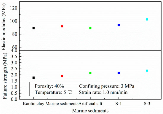 Elastic modulus and failure strength of HBMS, hydrate-bearing artificial silt and hydrate-bearing kaolin clay.