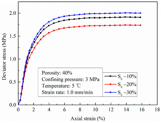 Stress–strain curves of HBMS with different hydrate saturations.