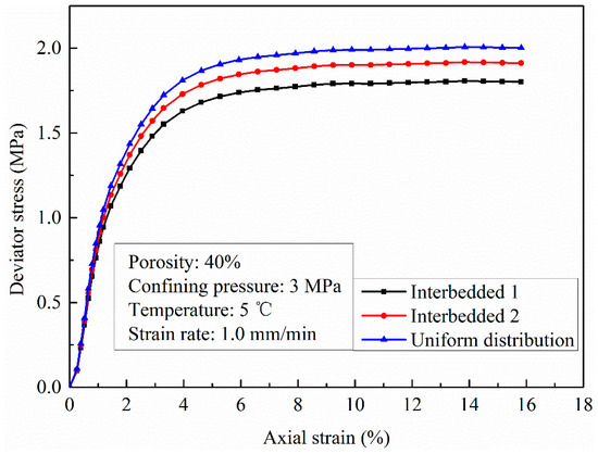 Hyodo et al. [57] suggested that the hydrate saturation level influences the mechanical behaviors of hydrate-bearing sands, and this study confirmed these results for HBMS, as shown in Figure 11a. The figure shows that the failure strength of HBMS increases slightly with the increase of hydrate saturation. Since the mixed sample preparation method was used to remold the HBMS, one can expect most of the hydrate structures would be a pore-filling type or a frame-supporting type. Since the hydrate is already in the solid form when it was mixed with the sediments, no cementation is expected since this occurs only during hydrate formation. Thus, hydrate particles mostly play a partial load-bearing role in the structure strength, leading to the slight increase of the failure strength of HBMS. Moreover, the relatively small change of HBMS in the interbedded form and uniform distribution form in Figure 11b can also be attributed to the fact that the hydrate structure in HBMS is mostly the pore-filling type or frame-supporting type, preventing cementation between the soil particles. Thus, even the hydrate layers are separated from the marine sediments layers, the failure strength change of HBMS is not so obvious.