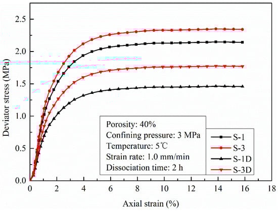 Hydrate dissociation has a significant influence on the mechanical properties of hydrate-bearing sediments [21,24]. The data in Figure 12 clearly show the stress–strain curves of HBMS formed by S-1 and S-3 marine sediments before and after hydrate dissociation. All curves present three compression stages: the elastic-plastic stage, the yield stage and the critical state stage, which indicates that hydrate dissociation would not dramatically influence the strain hardening characteristics of HBMS.